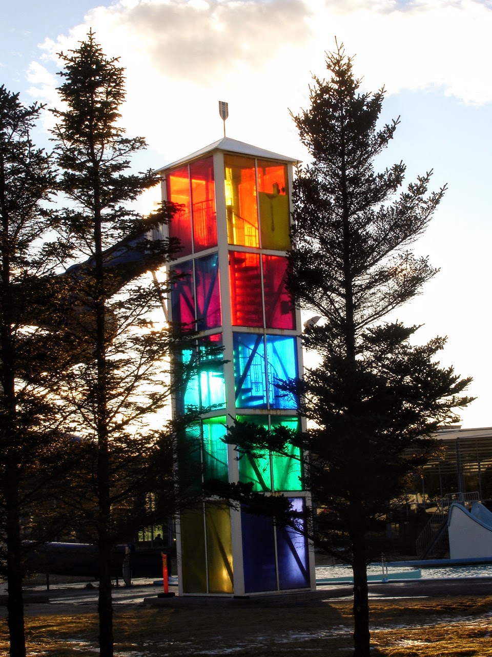 National Energy Authority : Plexiglass cylinders are placed in the middle of the basement floor in a stair opening and arranged on top of each other all the way up to the ceiling on the top floor. The cylinders are filled with alcohol-mixed water to prevent organic decay, the bottom cylinders are shorter with the darkest blue color that gradually brightens as the cylinders lengthen. The stair opening together with the circular mirror are integrated into the work and acts like a well that is looked down on from different heights. Below from the ceiling hang 4 lava stones. By melting the lava it transforms into a black glaze and at the same time forms very fine threads, " witch´s hair " , that reach all the way to the basement.