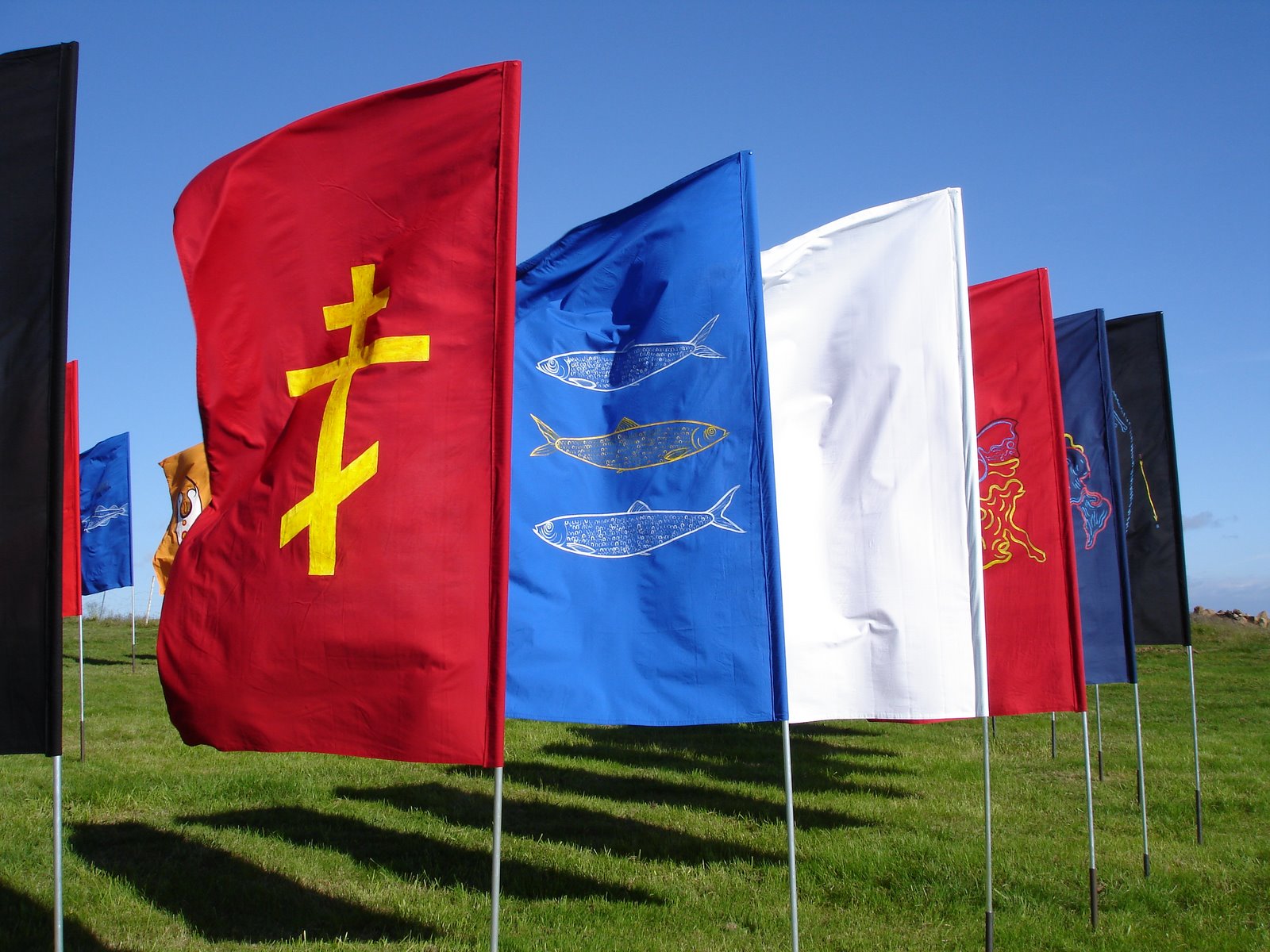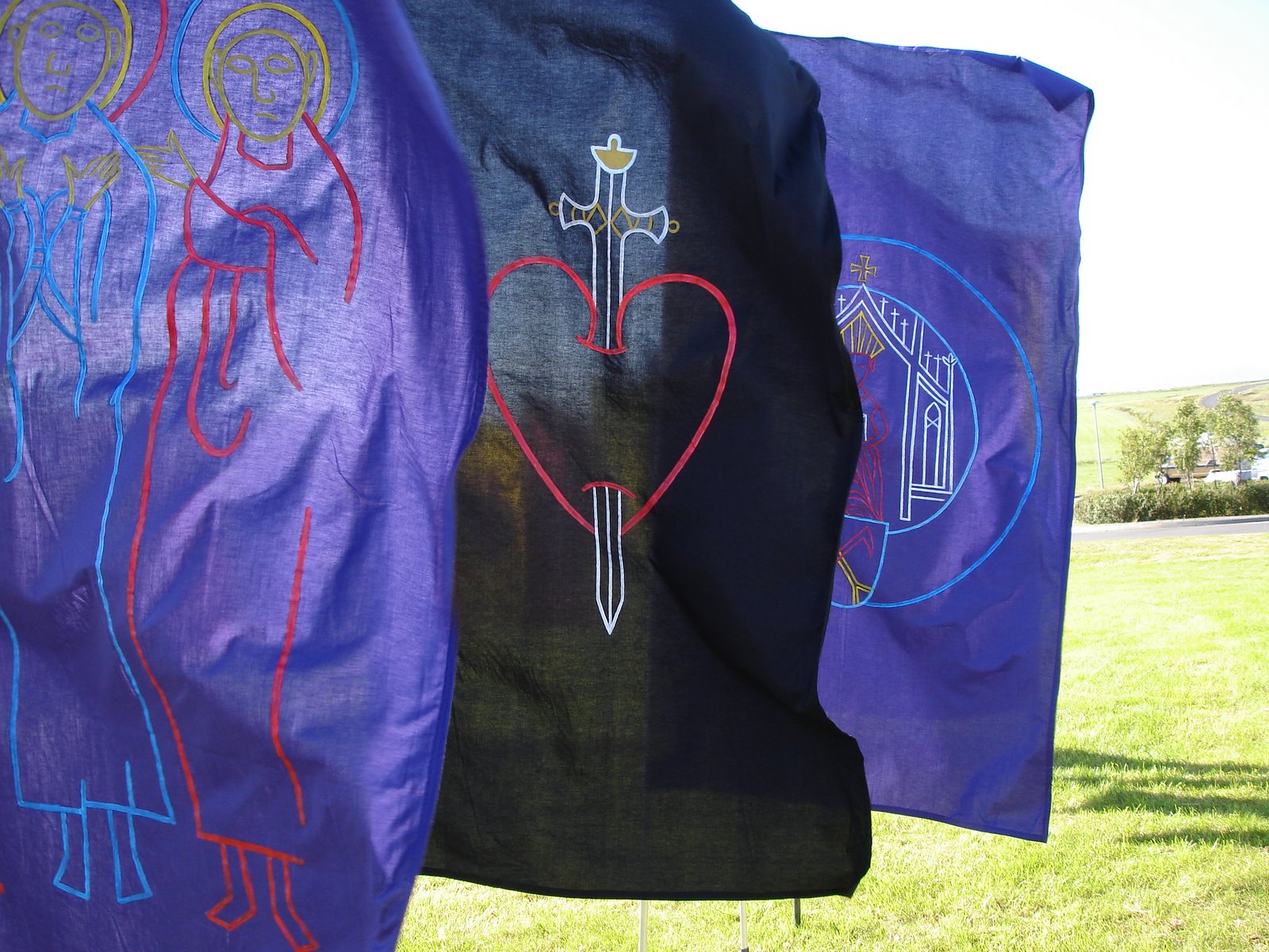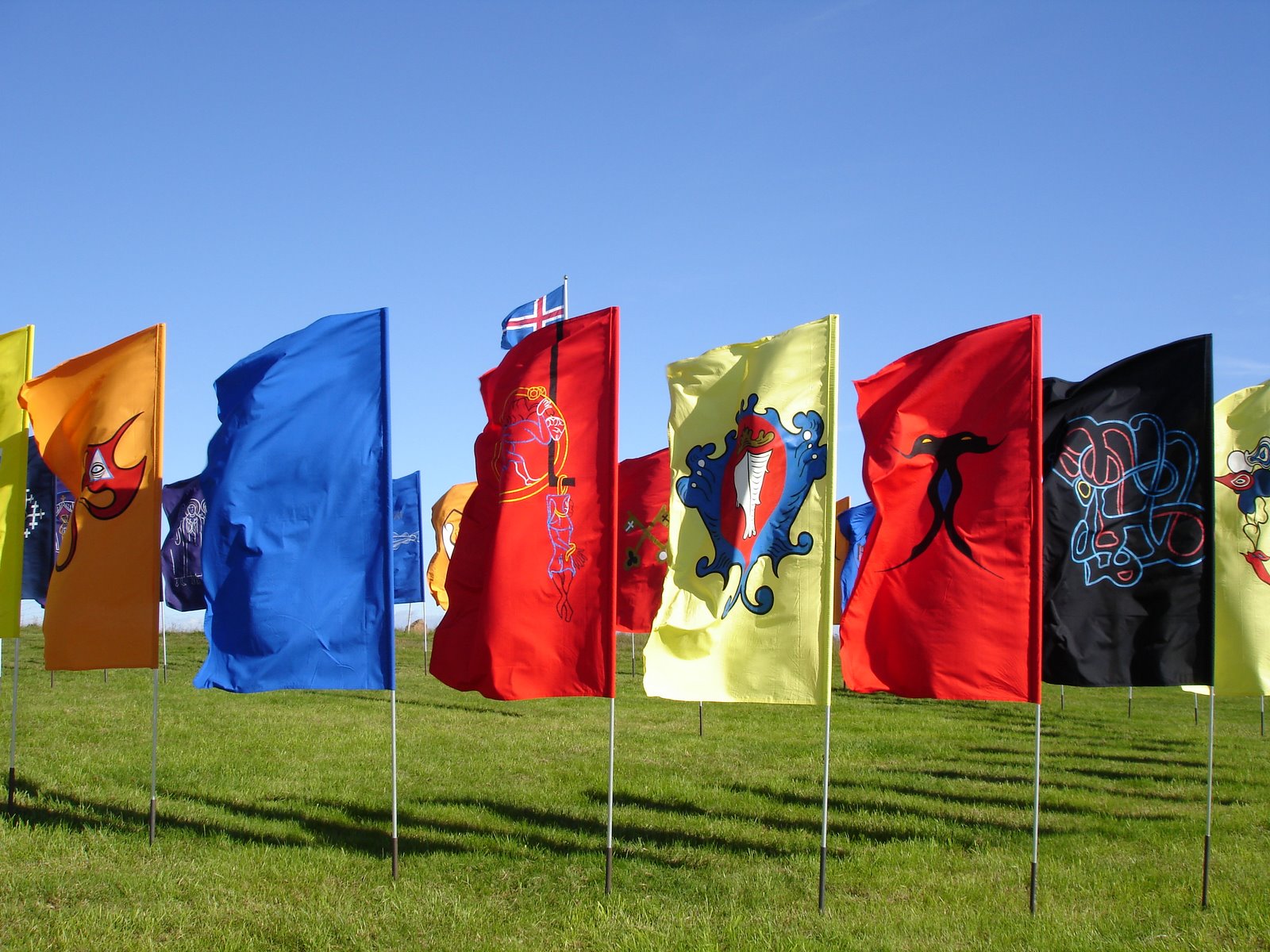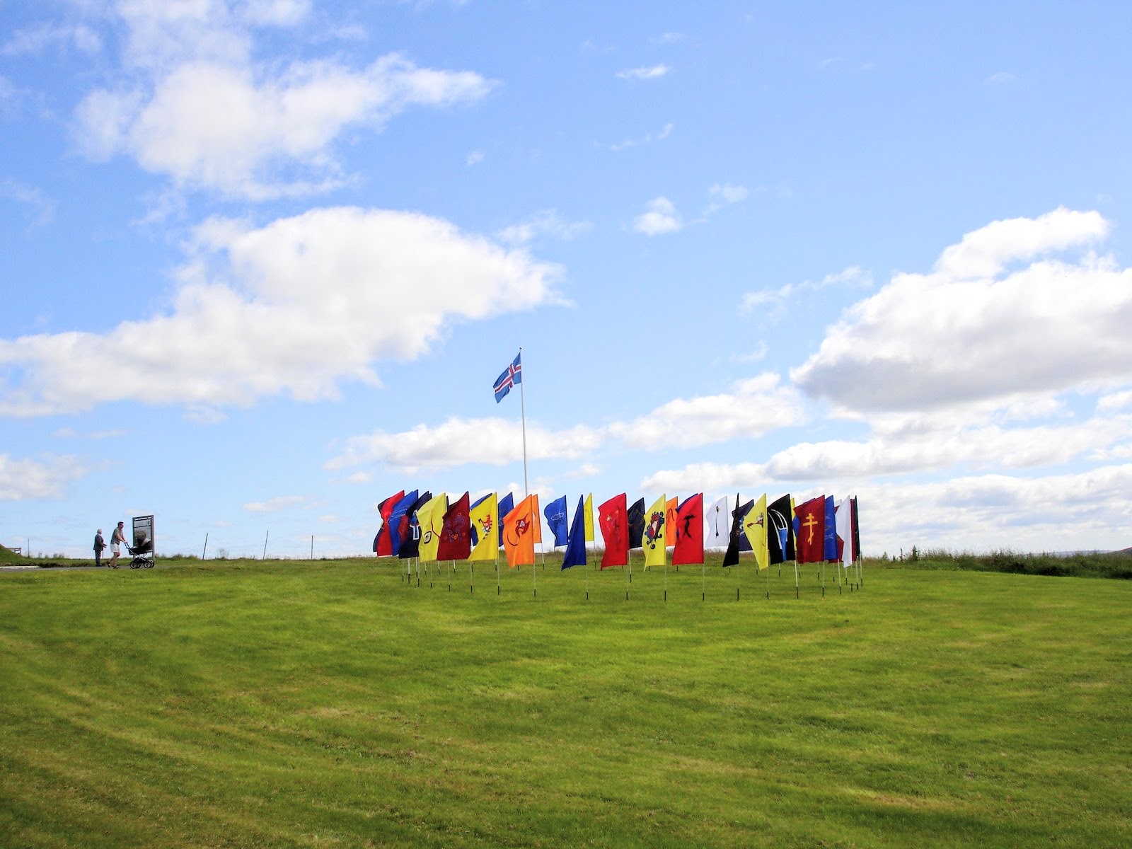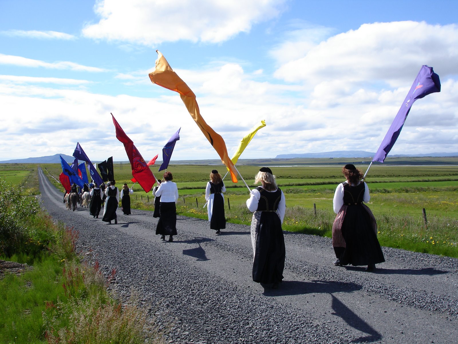 Installation in Skálholt south west of Iceland. 44 flags or as many as all bishops since the beginning of Christianity in Iceland on the occasion of 950 years since the consecration of the first bishop in Skálholt. The images on the flags comes from different sources like Iceland´s history, Christian religious symbols as well from other religions also from my own visual world and even from well known contemporary brands. The slower procession of horses and men became more closely related to the procession of bishops and priest who stream out of the church after mass. The flags make a circular form, they turn according to the direction of the wind and when the sun shines they form kind of a sundial.