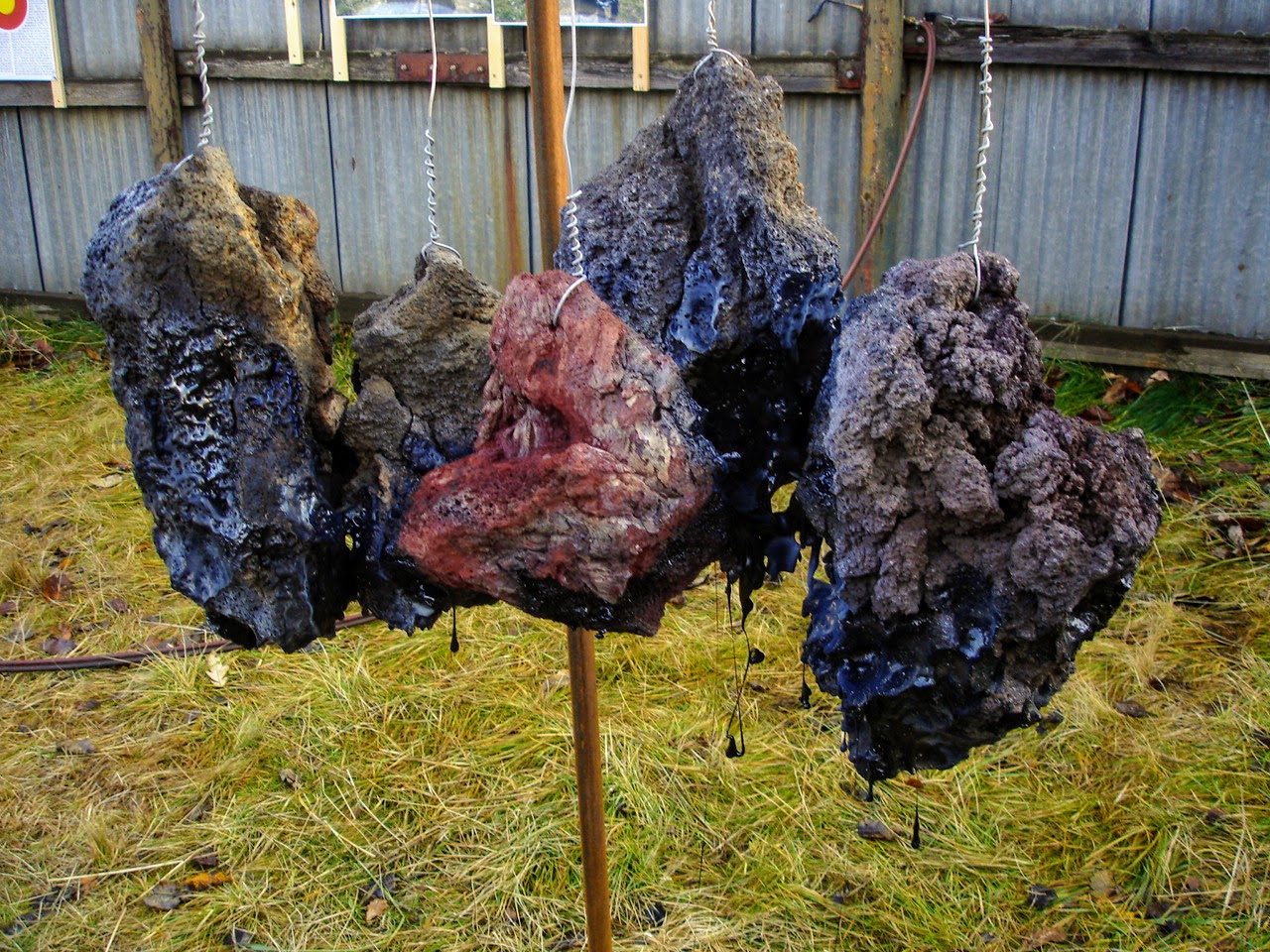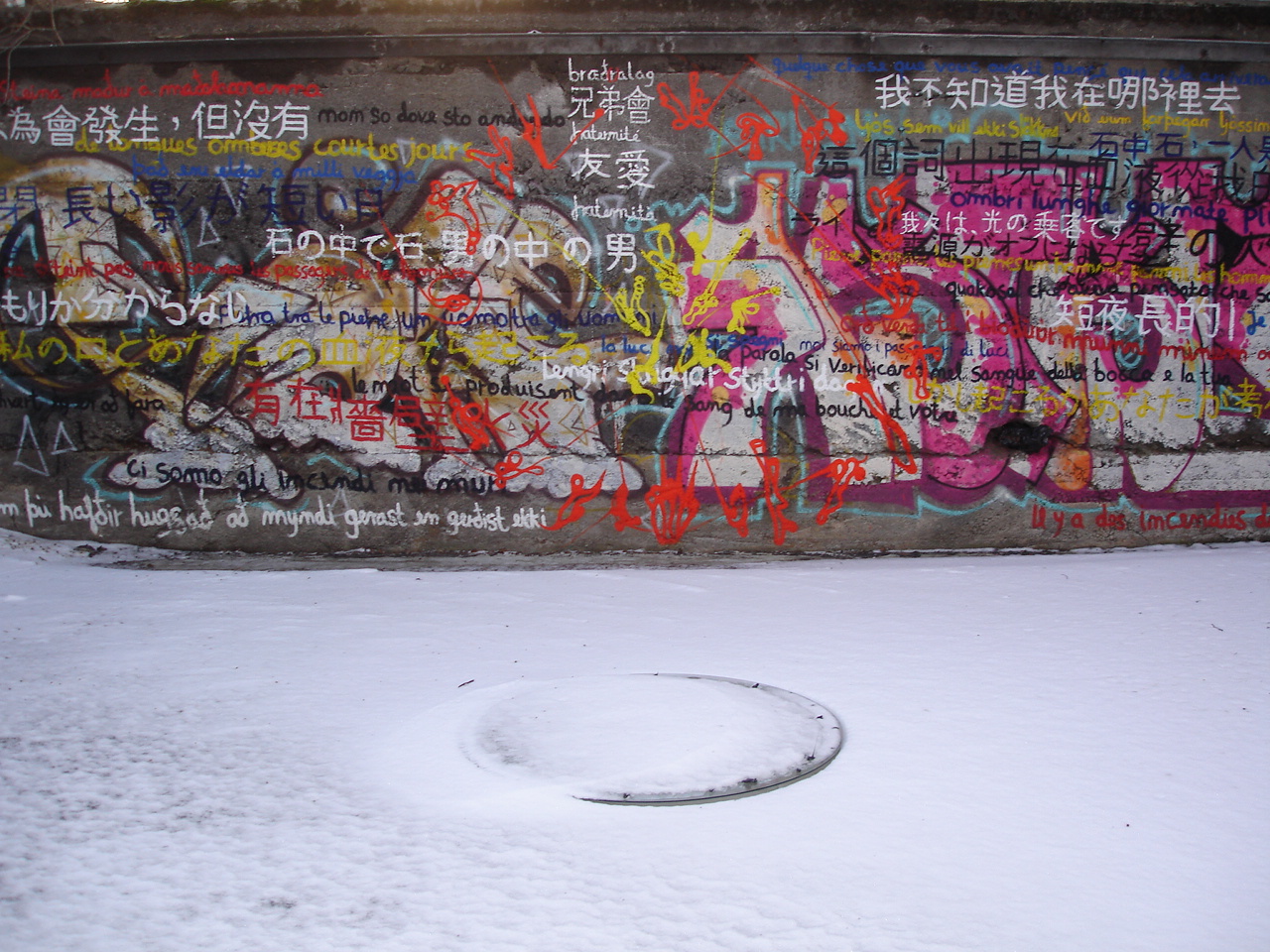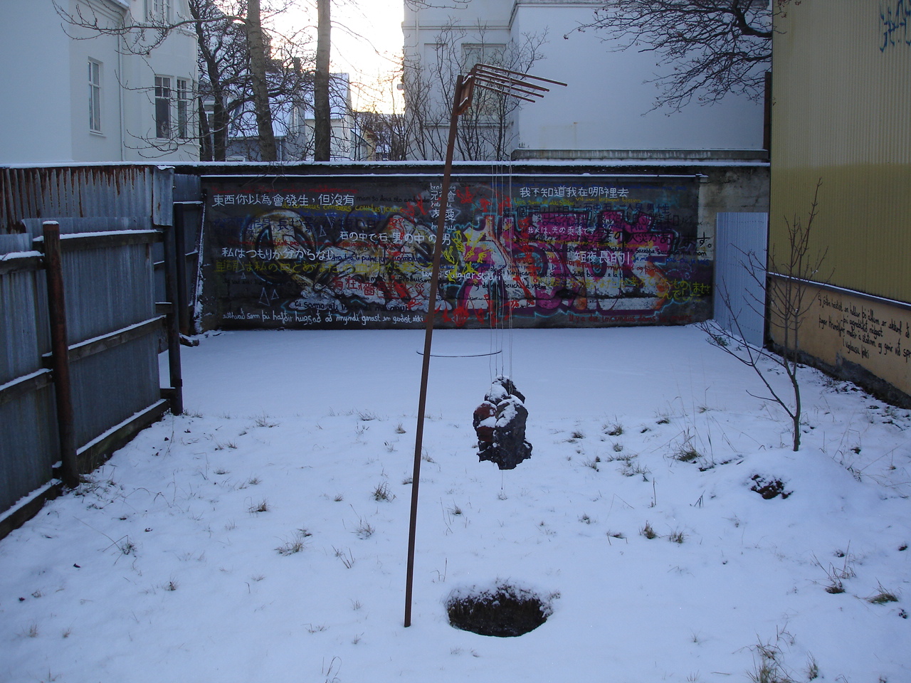 On the first day of winter 5 lava rocks were fused together in a hole during the opening of a new Sculpture garden. The rocks came from volcanoes in France, Italy, Japan, China and Iceland where the artist had worked before on different lava projects. Representatives from the 5 countries formed a circle around the hole, then the audience around them, thus manifest a brotherhood of mankind. On a wall in the garden the artist wrote a graffiti poem with the alphabets of the nations informing us that all languages are essentially the same. The mysterious letters written on the wall might have been a message from earth, a encouragement for a conversation between different cultures, in the same way the lava rocks form a brotherhood in the park.