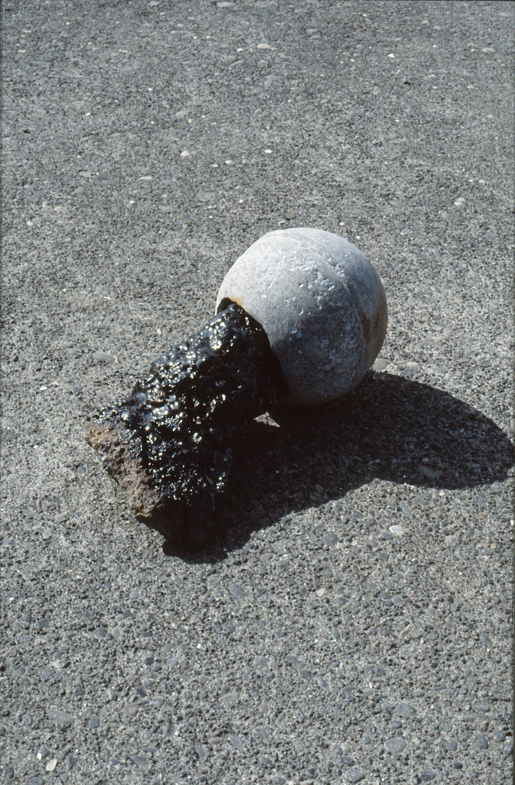 Environmental work in Búðir at Snæfellsnes, west of Iceland. " At midnight last July 2nd and 3rd, artist Halldór Ásgeirsson, opened an exhibition on the pier in Búðir by lightning a fire in nine iron bowls and floating them out into the estuary. On the pier, nine balls of netting and one bobbin have been melted together with lumps of lava. A tall driftwood drum hangs from the gallows, a kind of a dugout canoe filled with wild flowers which the artist picked up by the edge of the lava field nearby. The works are the result of Halldór´s stay offered by Hótel Búðir, where the artist used materials from the surroundings of the place. " From a press release.
