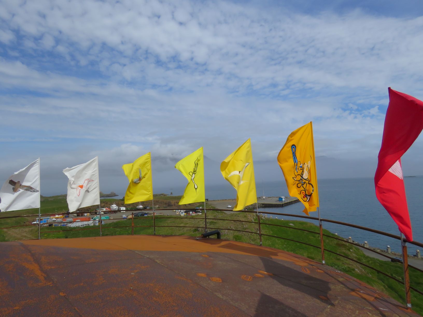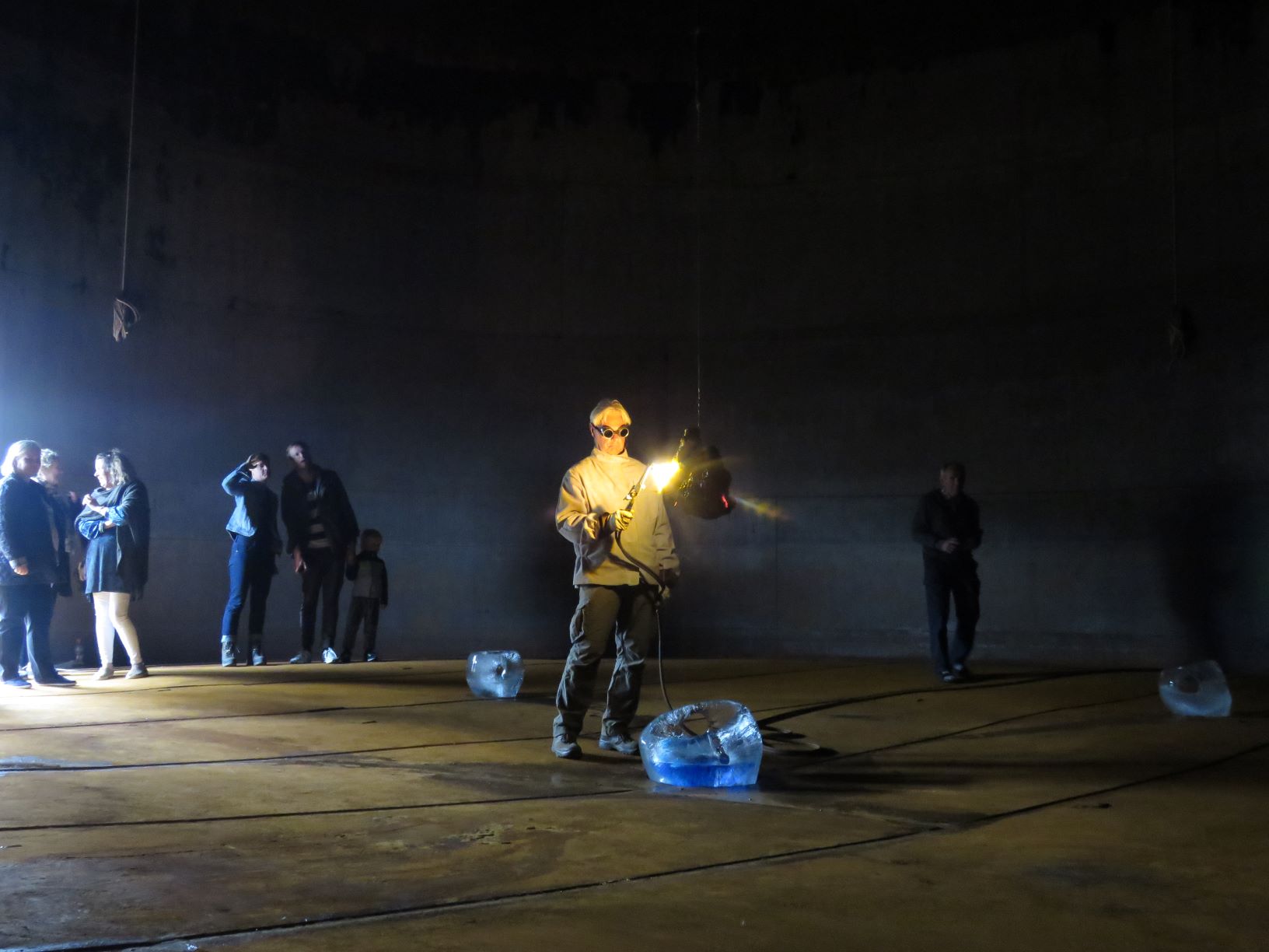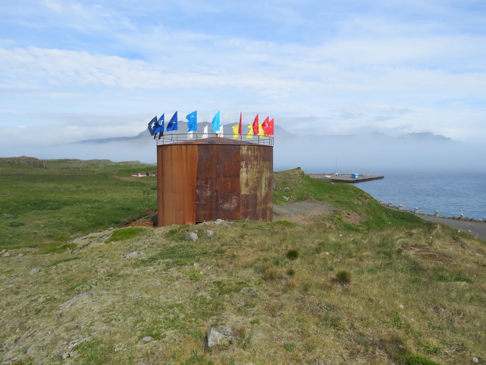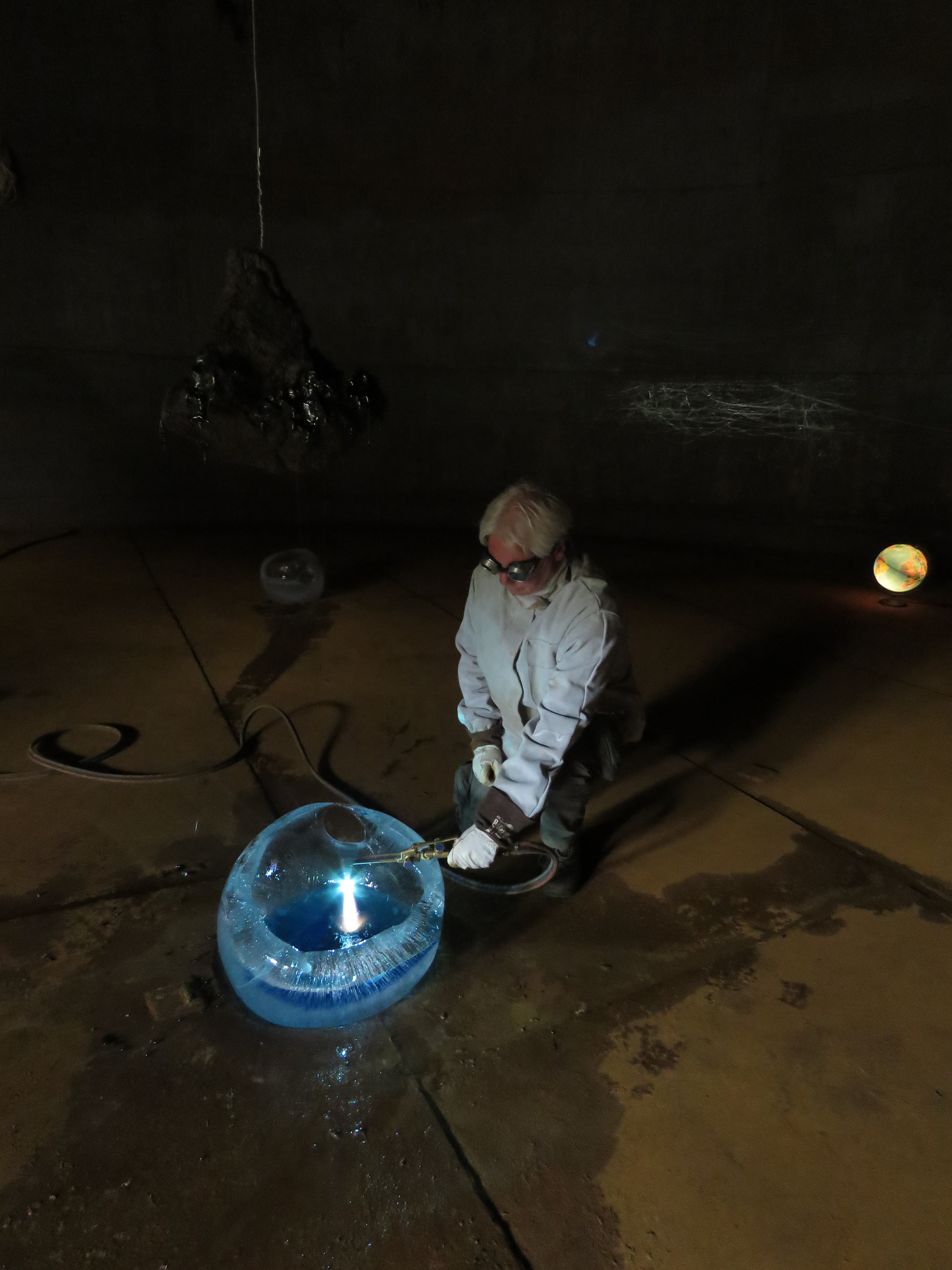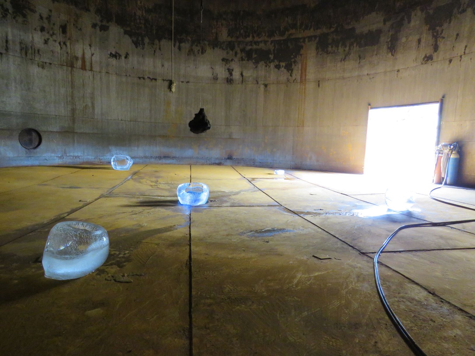 Performance - installation inside an empty fish oil tank at the opening of the exhibition " A rolling snowball " in Djúpivogur, Iceland. Melting a lavastone from the Laki eruption 1783-84. The Laki eruption and its aftermath caused a drop in global temperatures, as 120 million tonnes of sulfur dioxide was spewed into the Northern Hemisphere. This caused crop failures in Europe and as well in North Africa and India. It is estimated that the Laki eruption had been the largest lava flow in the history of human kind on earth. All the materials I used inside the tank exist also in the universe of space. On the roof of the tank I installed visual flags mostly of birds from the area which is located in one of the east fjords of the island.