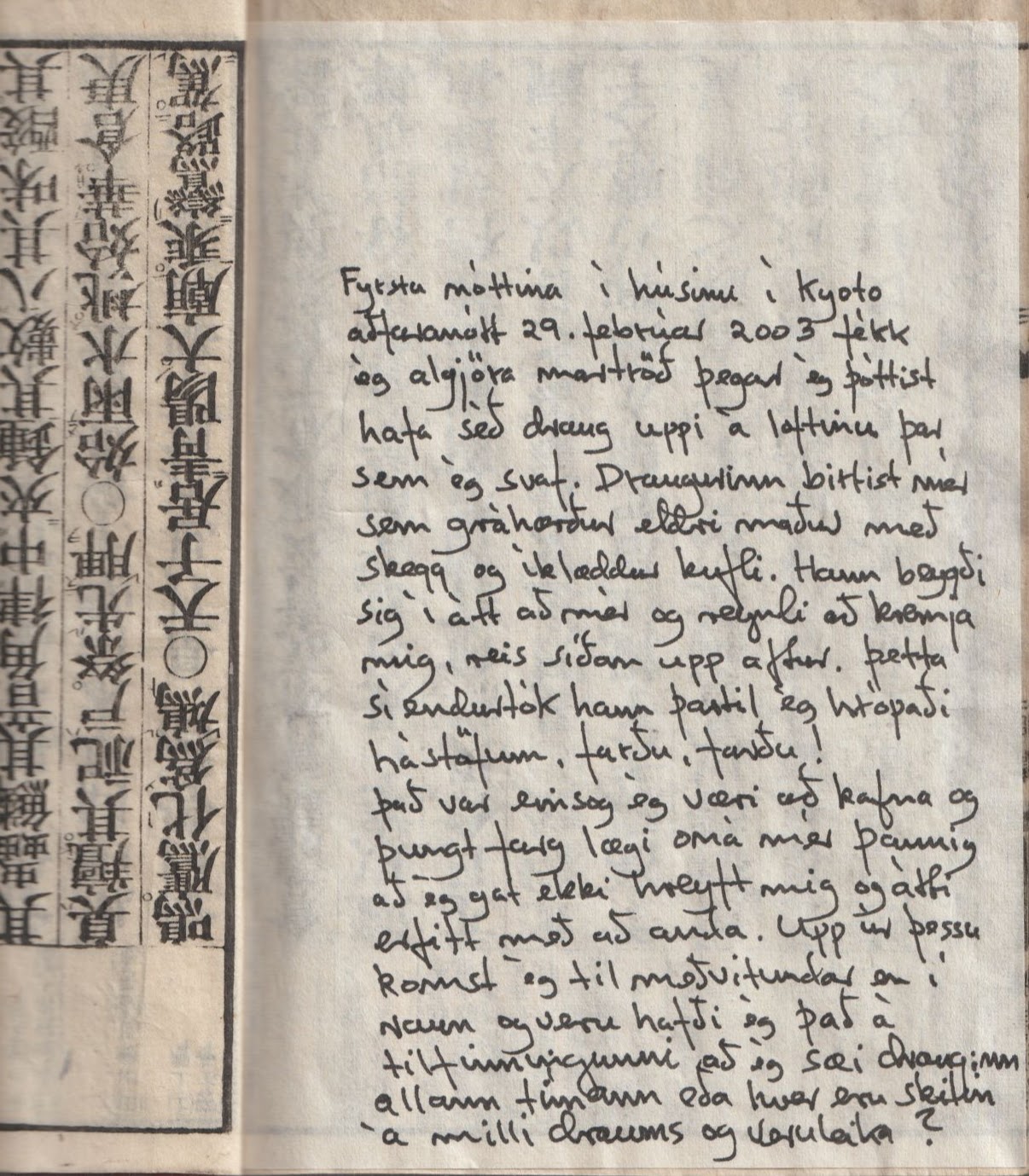 Memory points is an artist book in one copy. The beginning of the work can be traced back to Kyoto in Japan where I lived from 2002 - 2007. Once I wondered into antiquarian bookshop and spotted old books from 19th century. The visual letters and handmade paper called for a conversation between me and the mysterious pages so I bought some of these books. I started to handwrite notes in Icelandic over the letters that was already on the page without having any idea about the content. Anyway I did not finish the book before I moved back to Iceland. Many years later when Dulkápan, an electronic publishing, asked me for a work to be published I decided to finish the book by adding more memory points.
