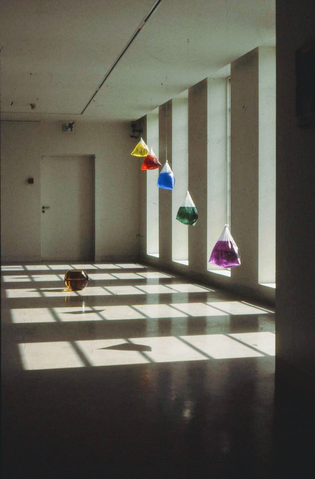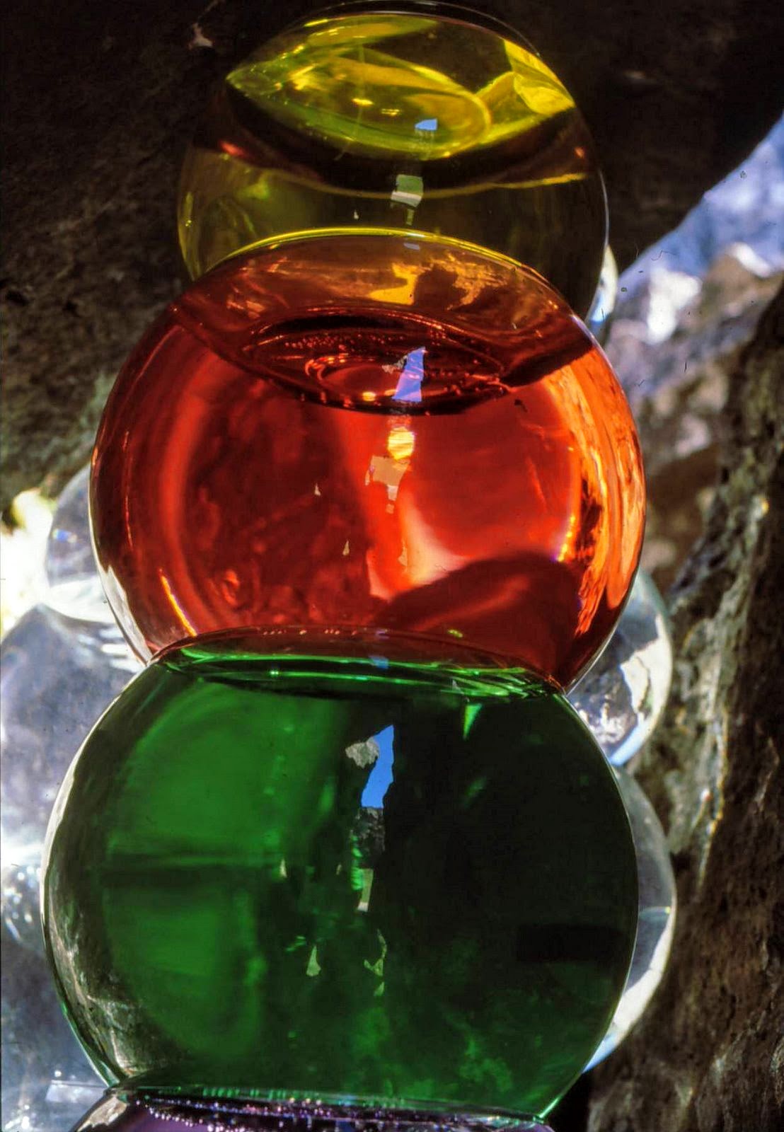 Outdoor exhibition with 14 artists on the occasion of the 1000th anniversary of Christianity in Iceland. Title: " The seven virtues old and new " all together 14, one for each artist to create an artwork in Stekkjargjá, a lava gorge were the exhibition was located. I placed my work in a rock crevices which I filled up with goldfish glass bowls of colored water. A fragile piece for the virtue " love ".